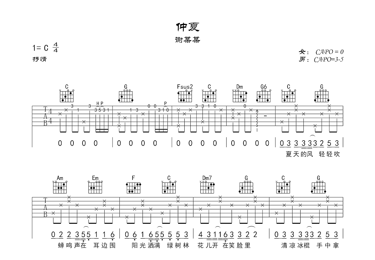 《仲夏》原版吉他订制扒谱,男声夹变调夹3-5品,女声可不夹或降半音调弦