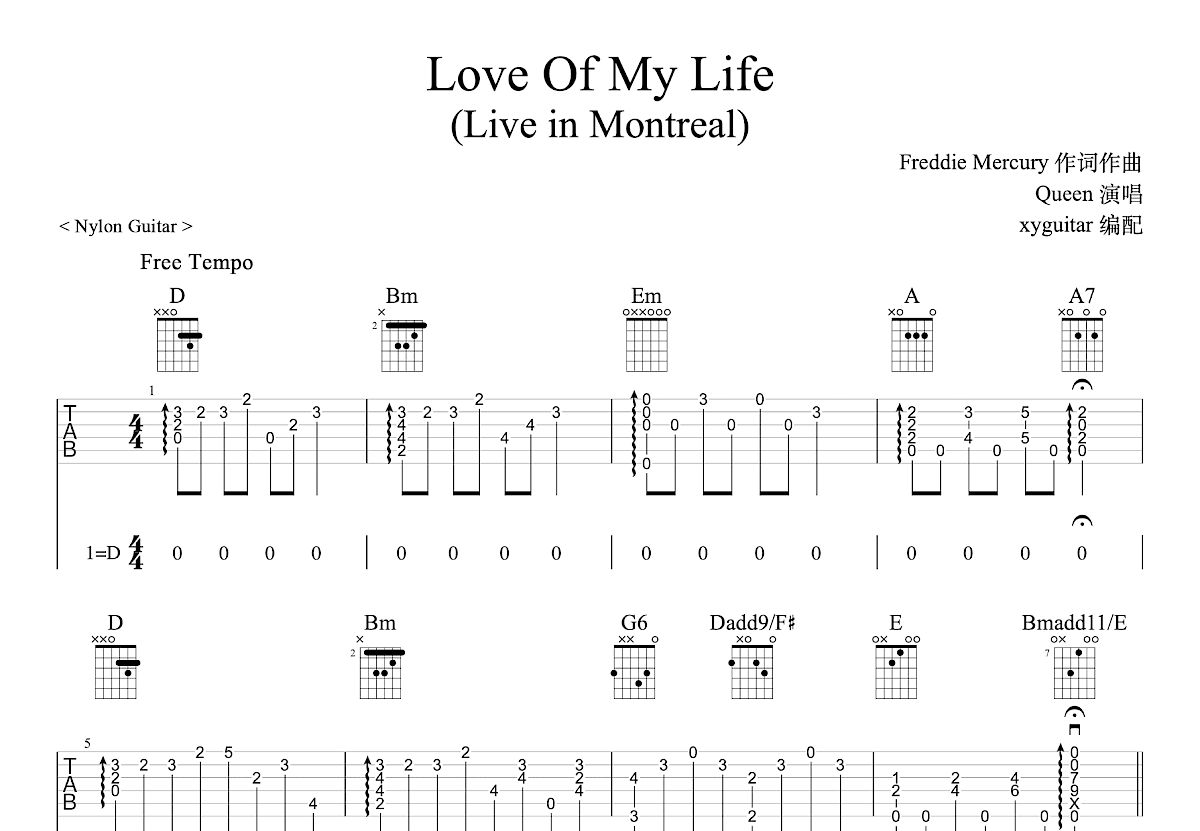 此为1981年Queen Rock Montreal演唱会Live版本,D调指法编配。