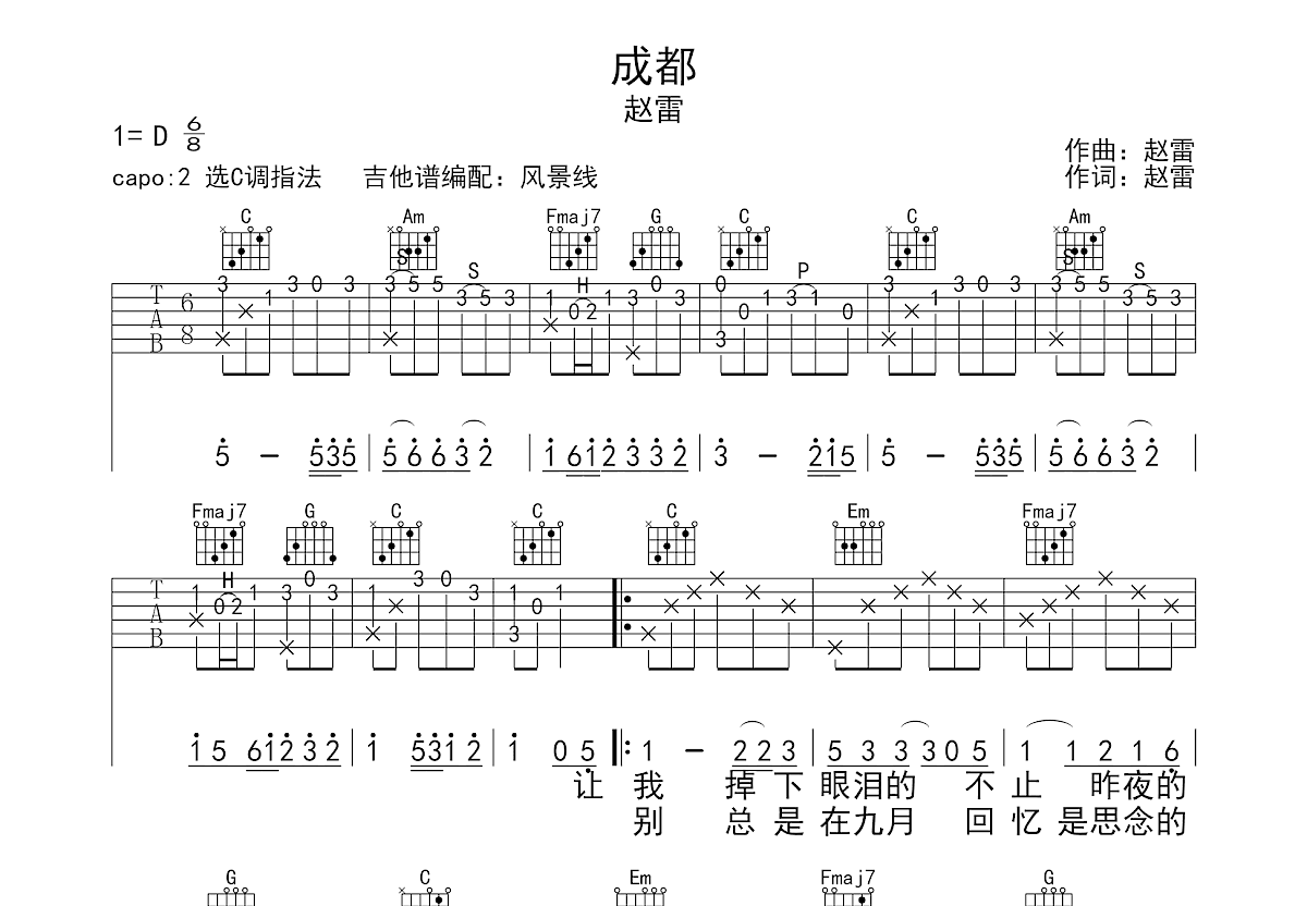 赵雷原创歌曲《成都》,原调D调,选用指法C编配,变调2品,简单易学。