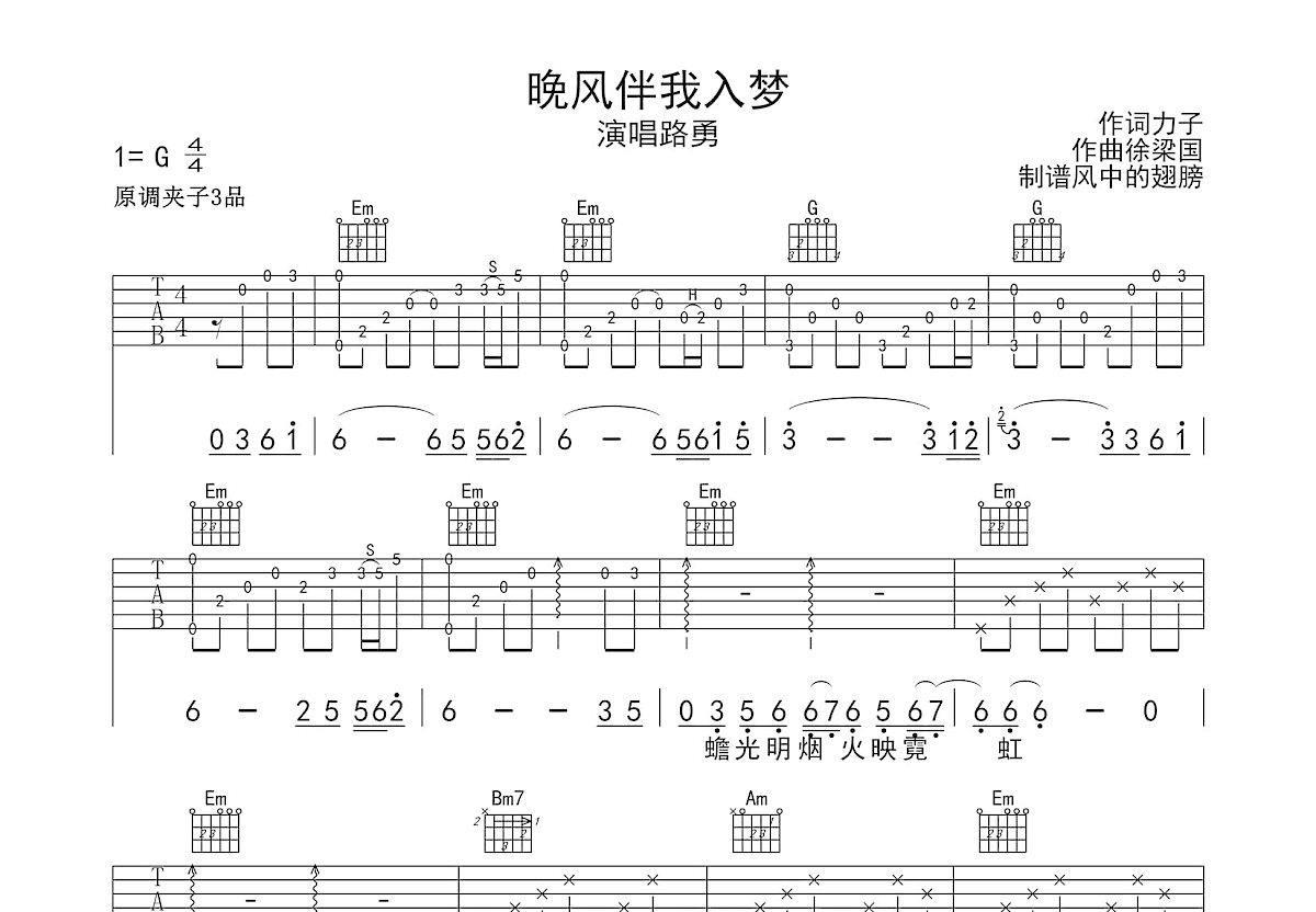 《晚风伴我入梦》, 路勇,原版吉他谱G调完整编配
