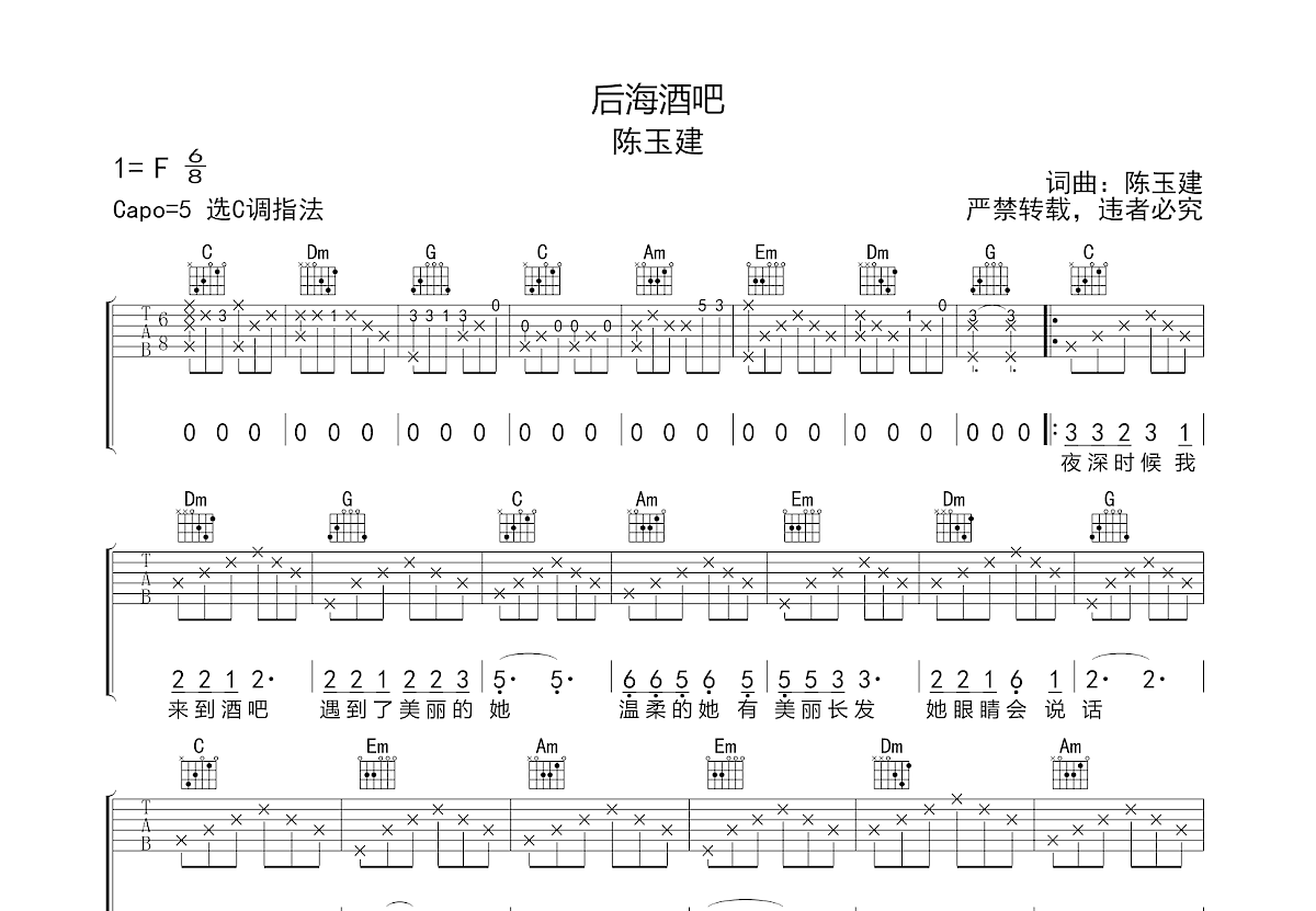 后海酒吧|陈玉建|吉他弹唱谱|免翻页|音频演示原调