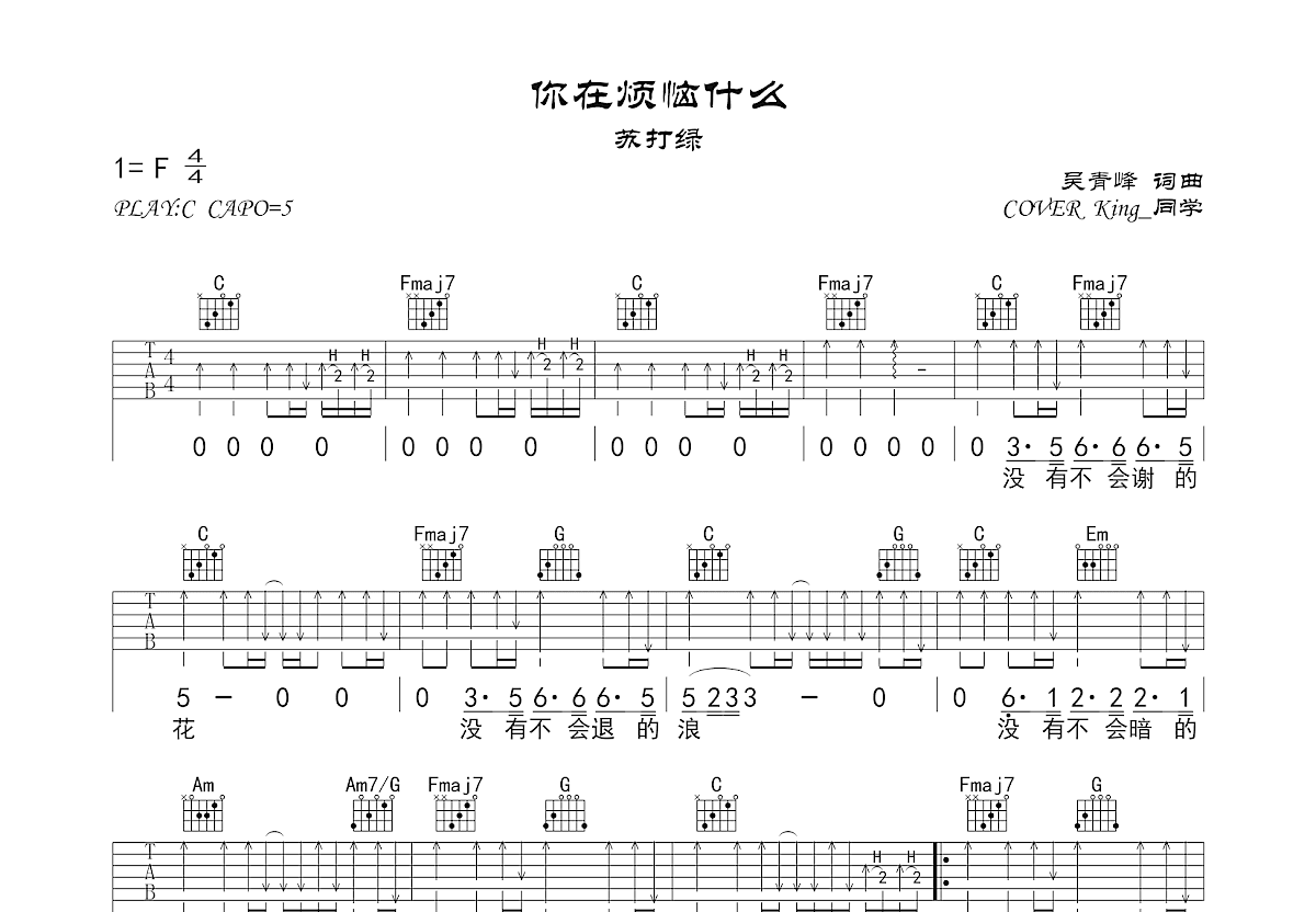 《你在烦恼什么》吉他纯净版...King_同学Cover,根据原视频细节完美扒谱,非常适合单吉他弹唱
