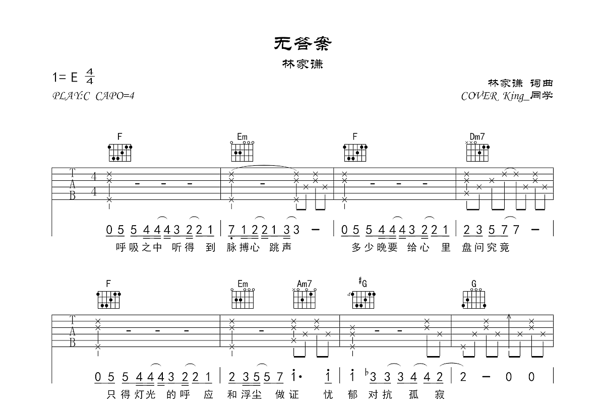 《无答案》吉他纯净版...King_同学Cover,根据原视频细节完美扒谱,非常适合单吉他弹唱