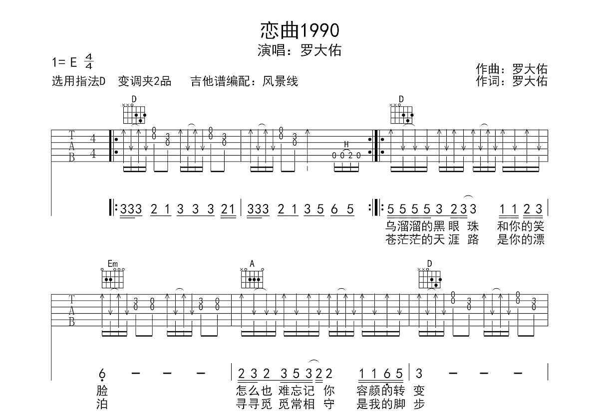 罗大佑经典歌曲《恋曲1990》原调E调,现按原调编配,采用指法D,变调夹2品。扫弦加花节奏型弹唱,有原版前奏`间奏`尾奏,编配简单易学。
