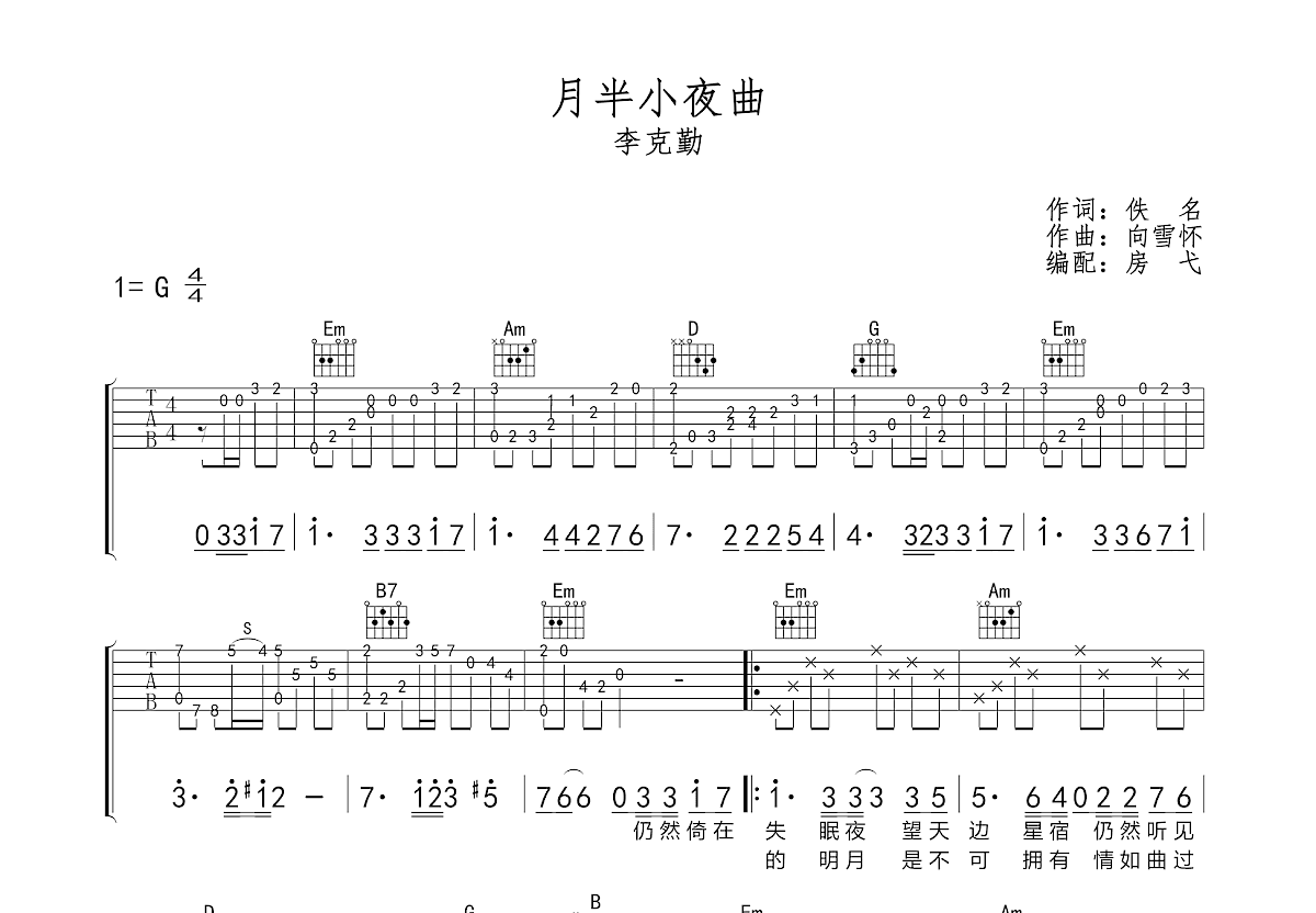 李克勤《月半小夜曲》G调弹唱谱,变调夹4品。非常抒情的粤语歌曲。