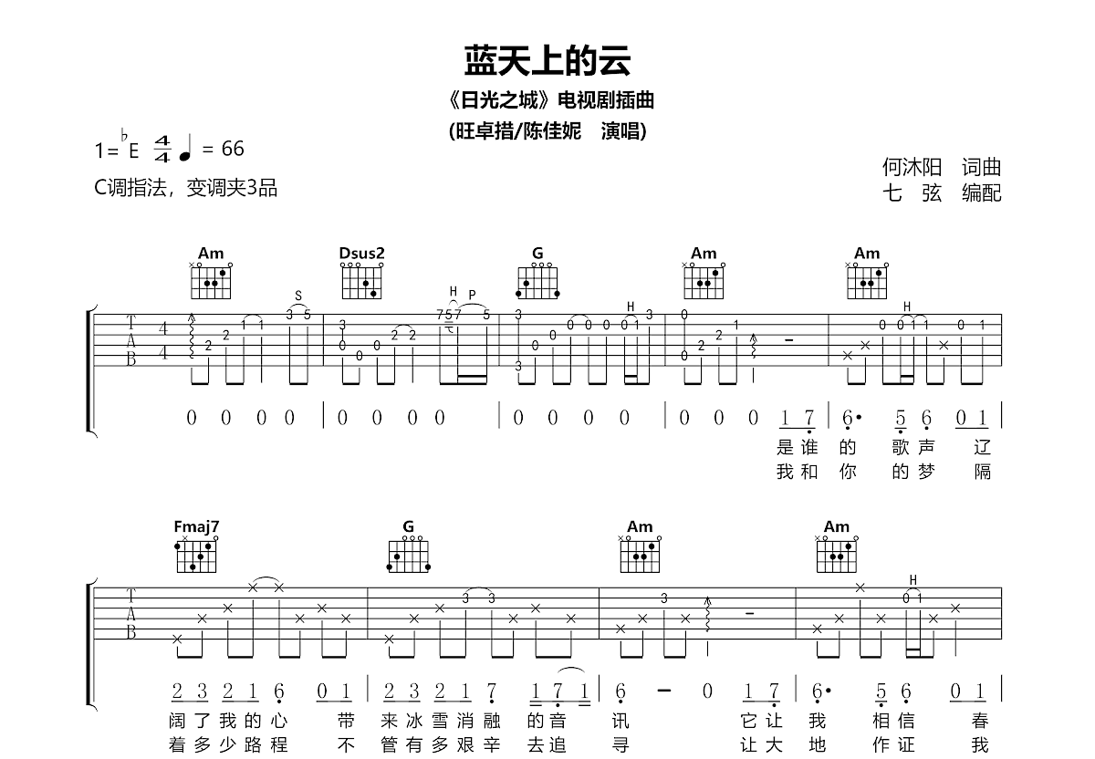 1、曲谱为琴友私人订制,旺卓措 陈佳妮-《蓝天上的云》精编吉他弹唱谱;
