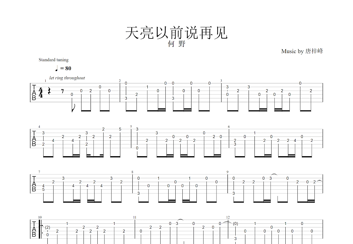 《天亮以前再见》指弹吉他谱,G调指法编配,简单好听!