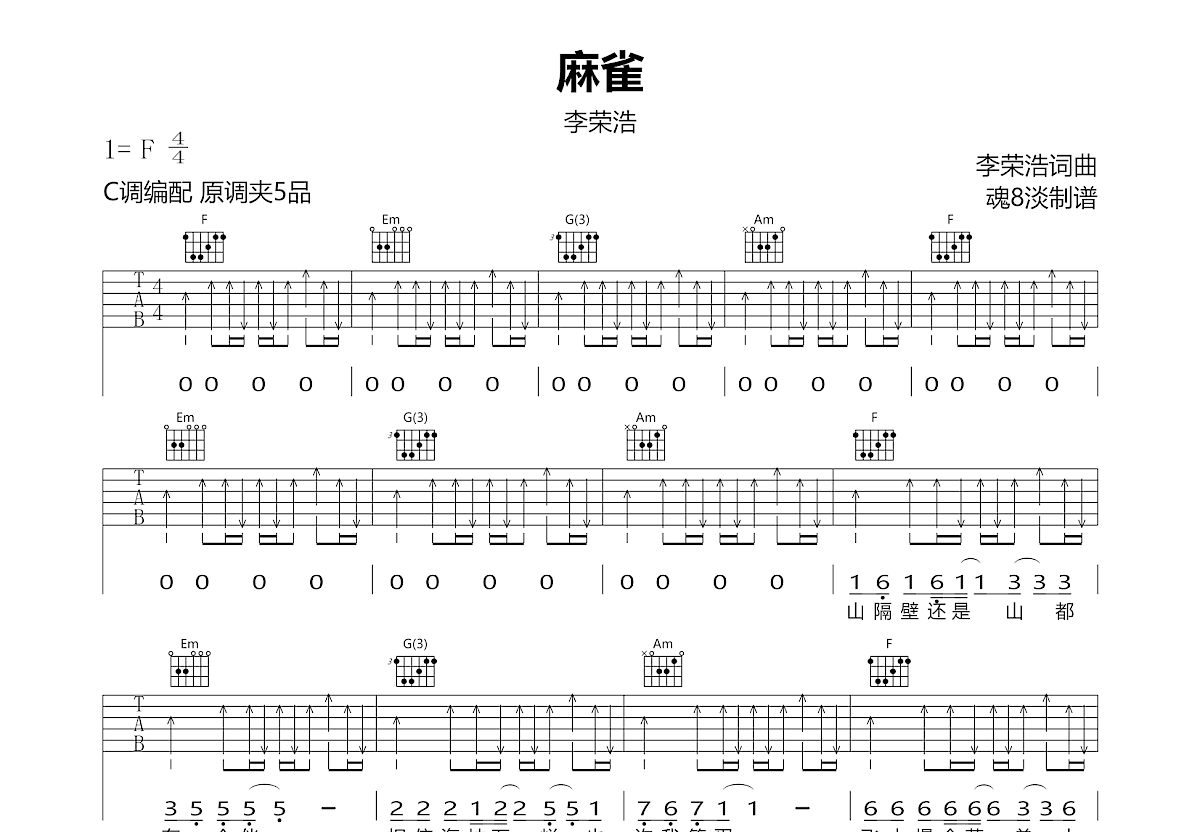 麻雀 C调吉他谱 李荣浩。请试听完整音频示范效果。