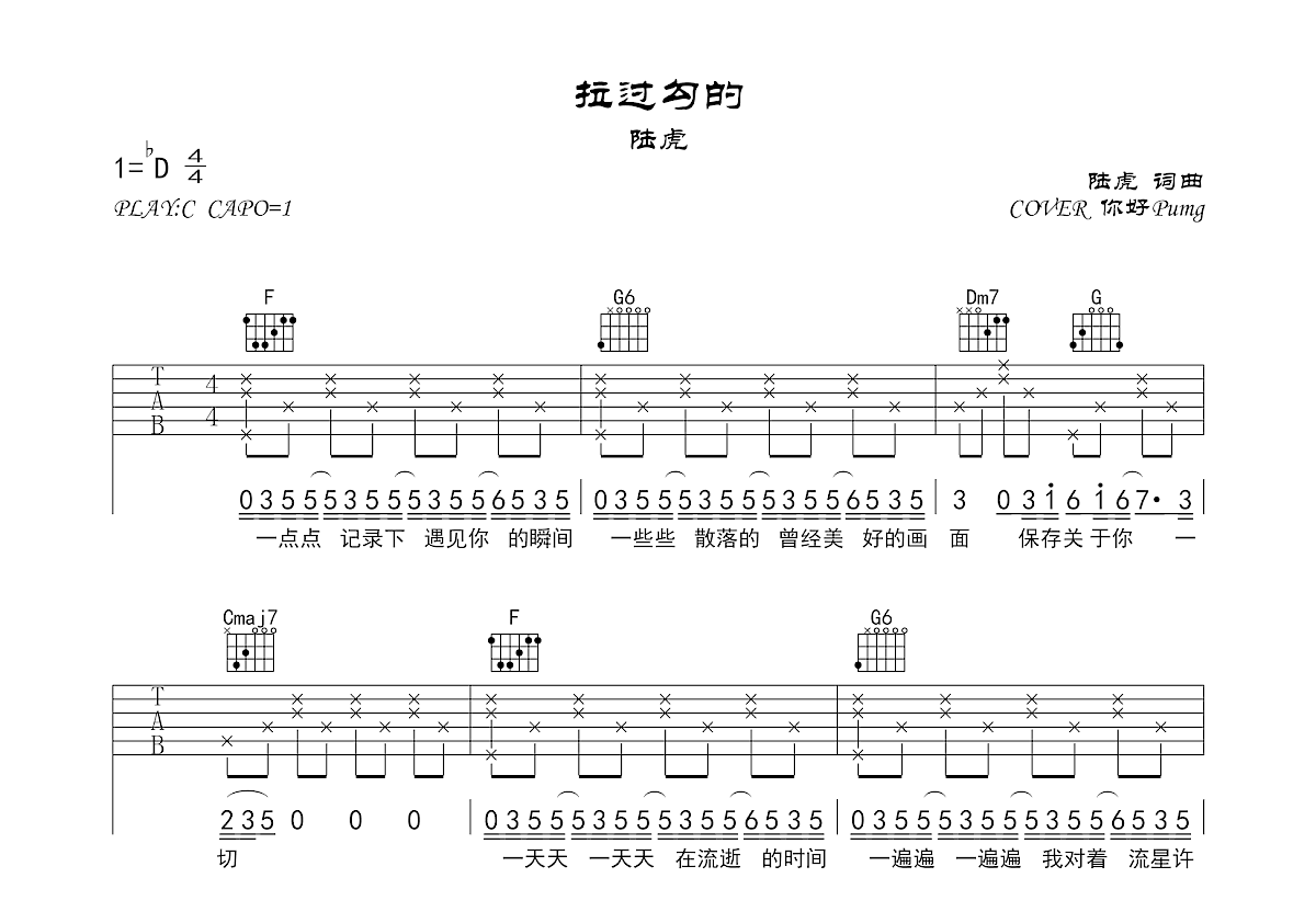 《拉过勾的》吉他纯净版...你好Pumg Cover,根据原视频细节完美扒谱,非常适合单吉他弹唱,与试听音频完全一致,请试听满意后再进行购买
