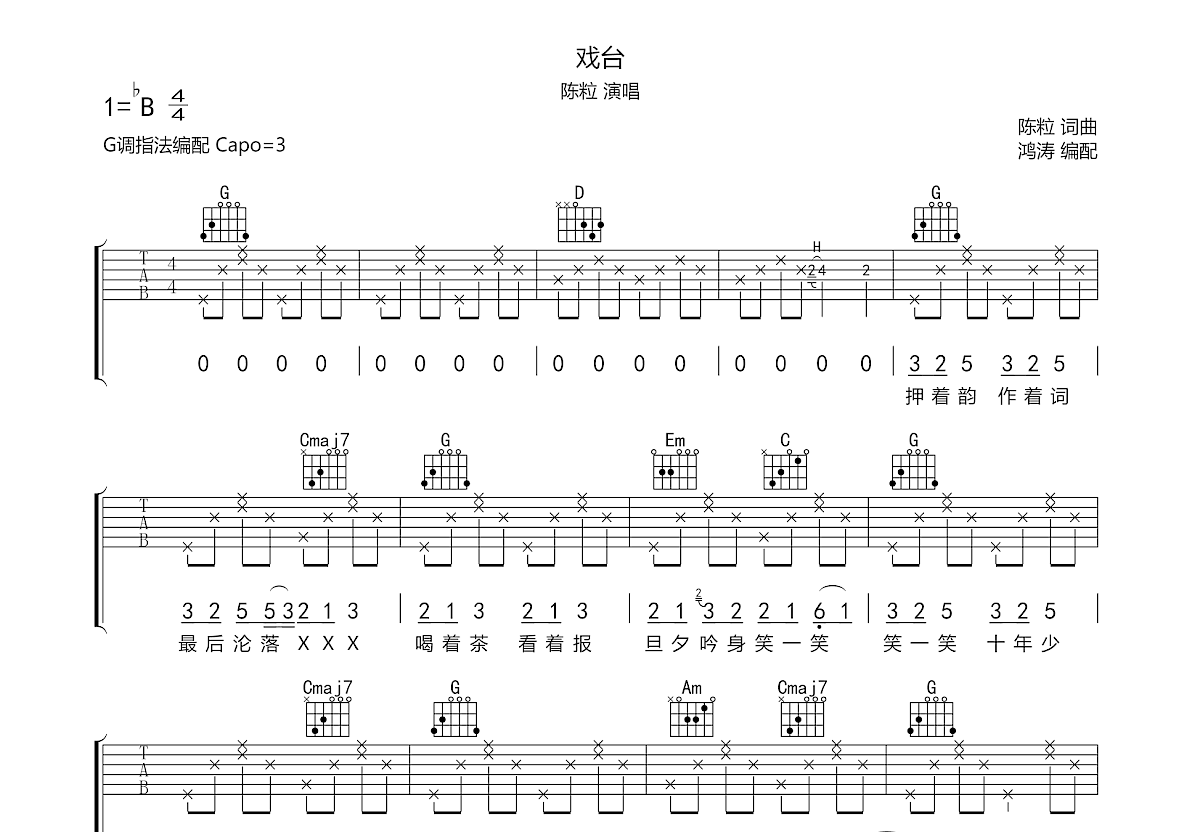 《戏台》弹唱吉他谱。G调指法简单版,编配时略去了原曲中的三弦Solo。