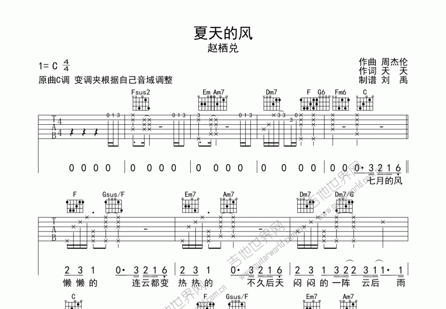 赵栖兑《夏天的风》C调吉他谱 原调编配,变调夹根据自己音域使用 完整前奏尾奏,主歌部分根据歌曲中律动编配,副歌主观编配,适合弹唱 谱子中在(4、5、 6)弦上的X代表拍弦技巧,并且用切音符号标记