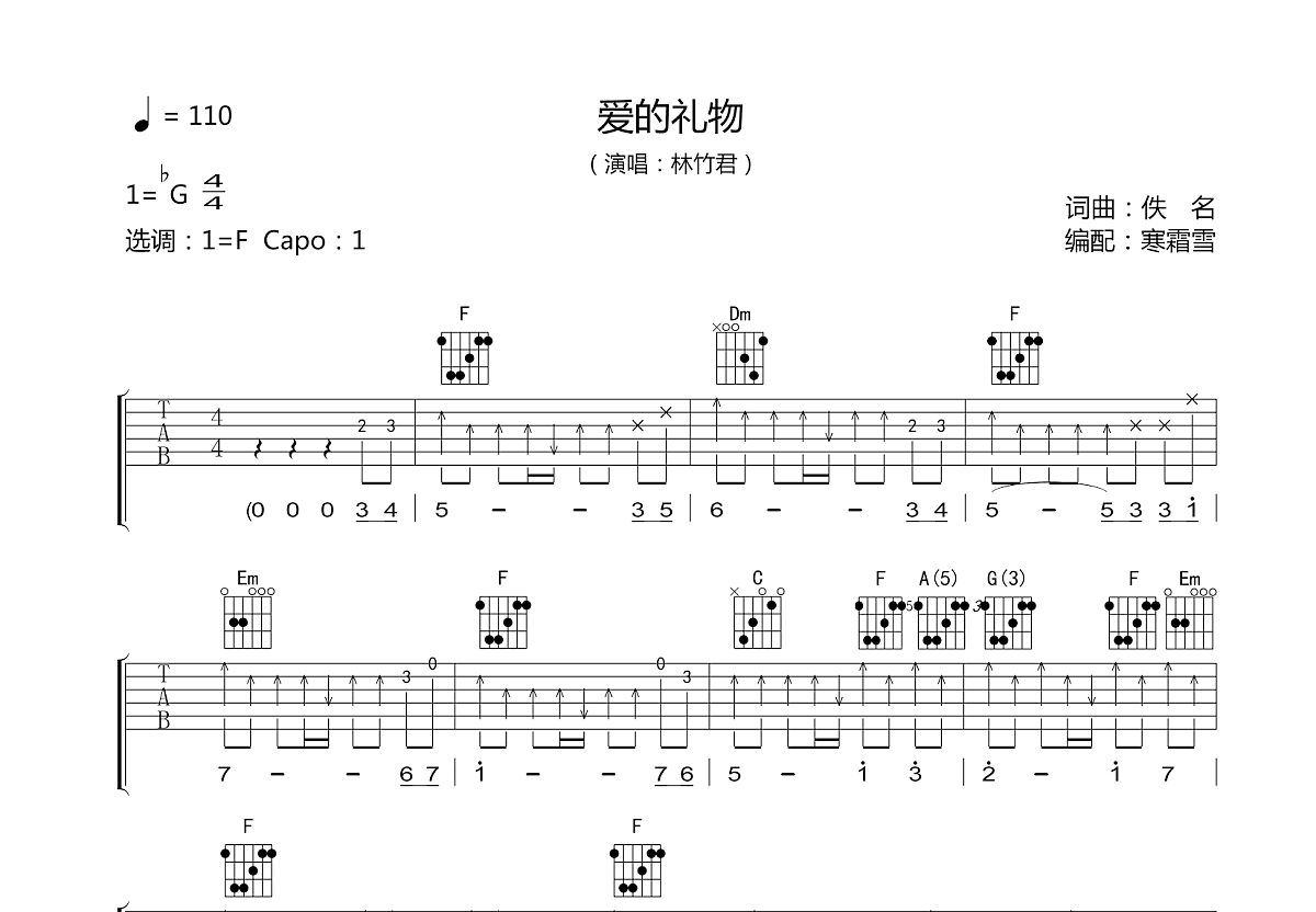 1.林竹君的《爱的礼物梦》吉他弹唱谱,改编简化规整指法;