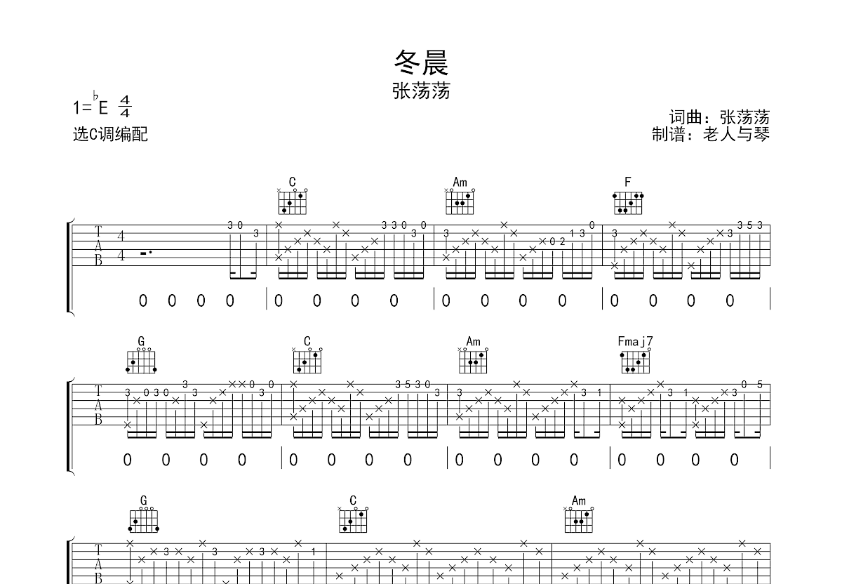 张荡荡《冬晨》原版吉他谱,原调Eb,选C调编配,如按原调需用变调夹夹在三品处