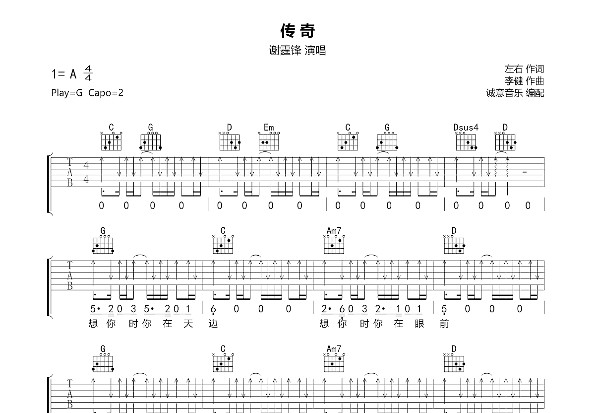 谢霆锋《传奇》好声音LIVE版,G调指法编配,原调夹2品。个人觉得这个版本比原唱(王菲、李健等)更有味道,很好听,扫弦弹奏也不难,没有横按,很好上手。音频仅录制小部分做示范。