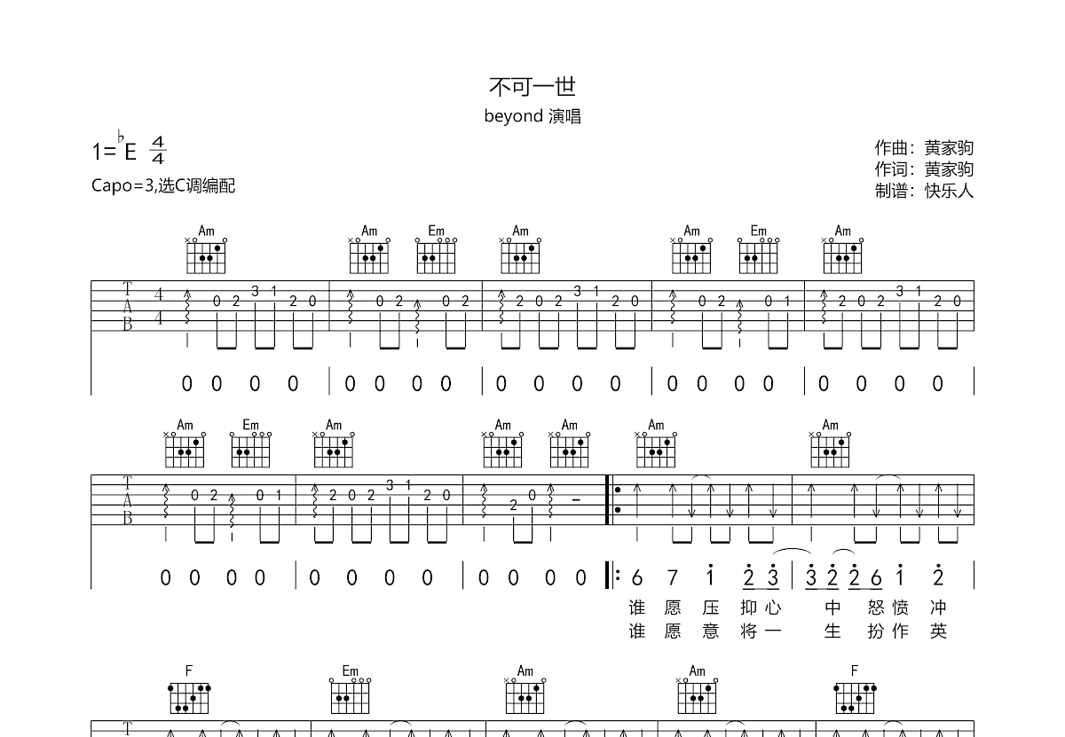 beyond《不可一世》C调吉他谱,整体编配适合一把吉他弹唱,琴友们可以试听完音频,喜欢再买吧!