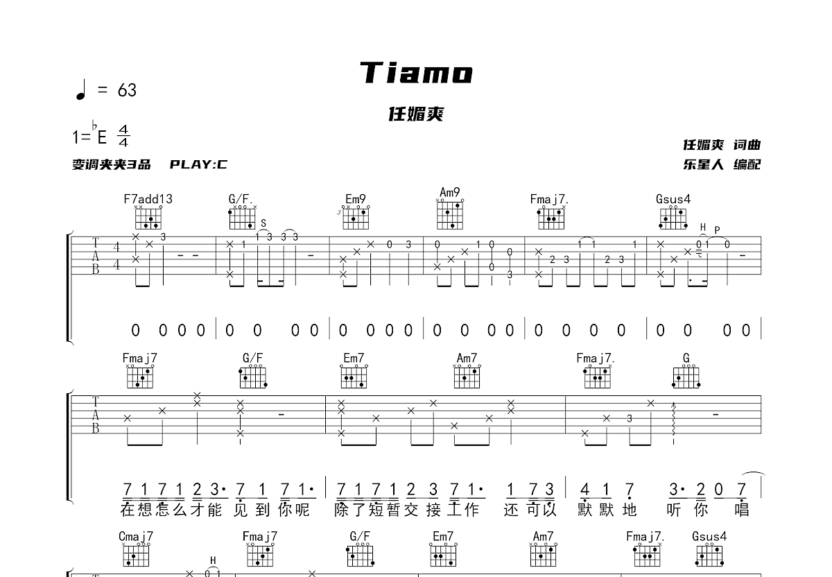 2021中国好声音 第1期 任媚爽《Tiamo》C调吉他谱。高度还原版吉他谱,好听易上手。