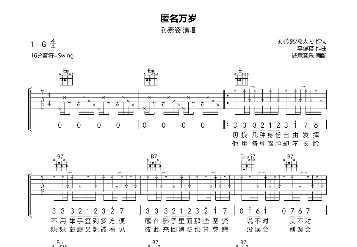 孙燕姿《匿名万岁》G调编配吉他谱,原调为bG。