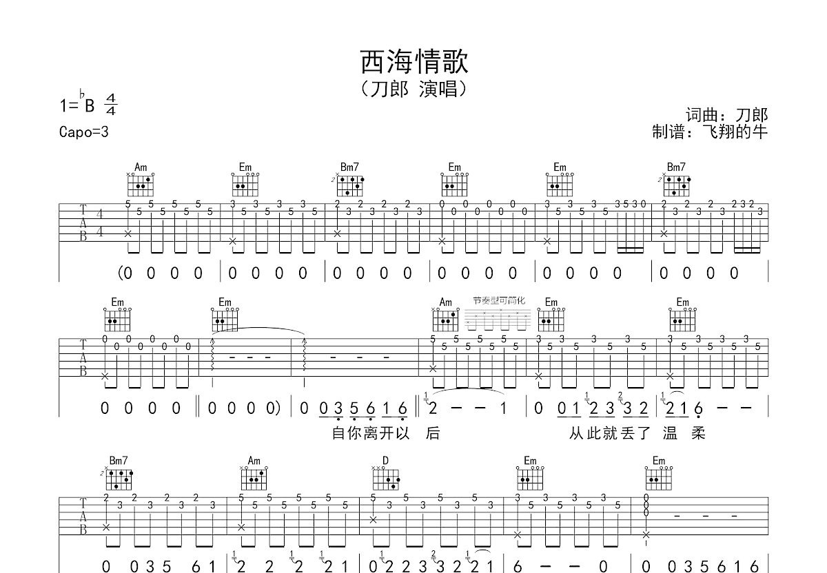 ★刀郎《西海情歌》吉他谱,按原版编配,有重点有细节,保证歌曲完整,不删减小节。 曲谱部分可更改为自己适合的节奏型。曲谱问题请私信