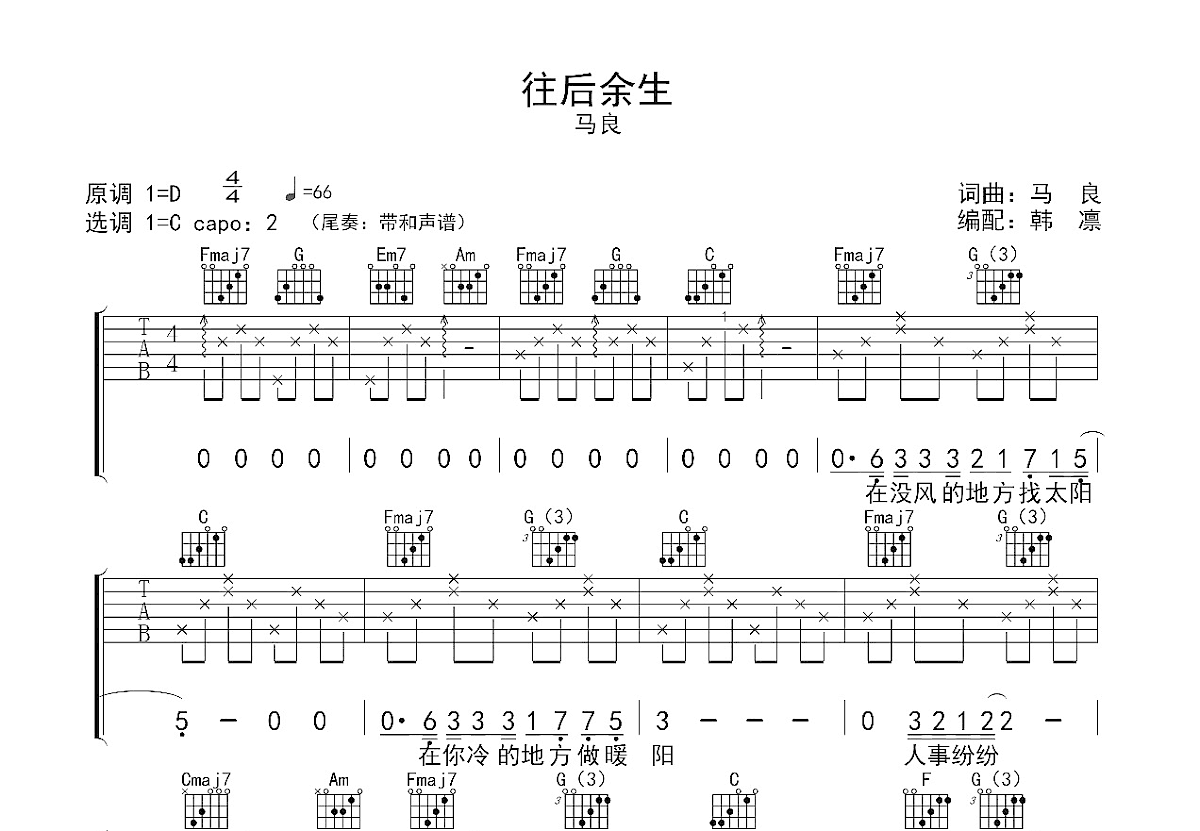 马良《往后余生》,词曲:马良,速度66,原调1=D,选调1=C,capo:2,示范capo:3,吉他/演唱:韩凛,歌曲副歌加入卡宏鼓