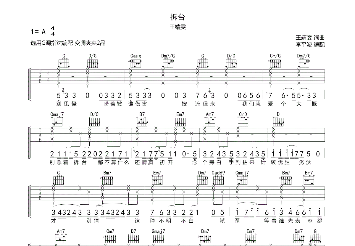 王靖雯《拆台》G调指法原版编配。