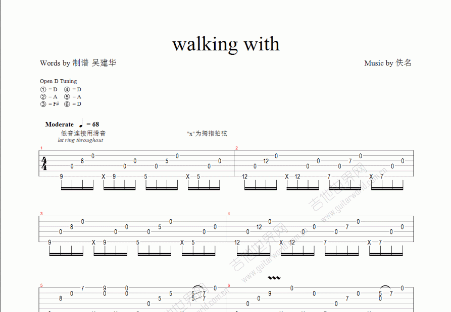 为琴友私人定制的指弹谱。本曲是openD调弦,技巧比较多也复杂,有些技巧符号不好表示(比如点弦保留音后面弹奏多个音符后再将之前点弦的音勾弦)请仔细参照视频练习。