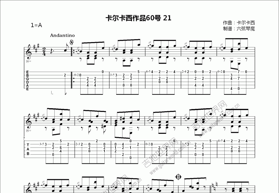 经典《卡尔卡西》渐进式练习曲乐谱,是古典和指弹初学者的最佳入门选择。 这是一首难得的装饰音练习曲,对学习演奏浪漫风格作品与流行音乐会有很大帮助。注意两个装饰音要演奏得灵巧,多音的和声则要丰满,左手换把要求敏捷。