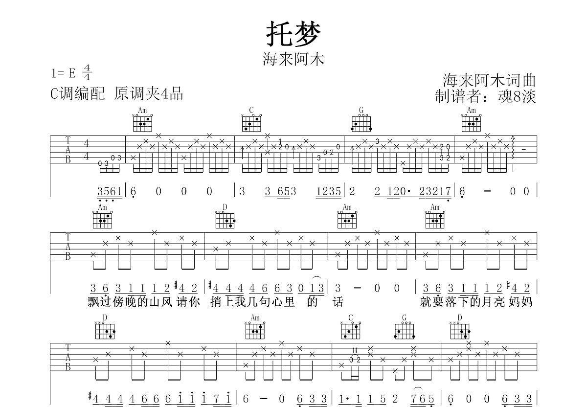 海来阿木《托梦(民谣版)》C调吉他谱。好听易上手。请试听完整音频效果。