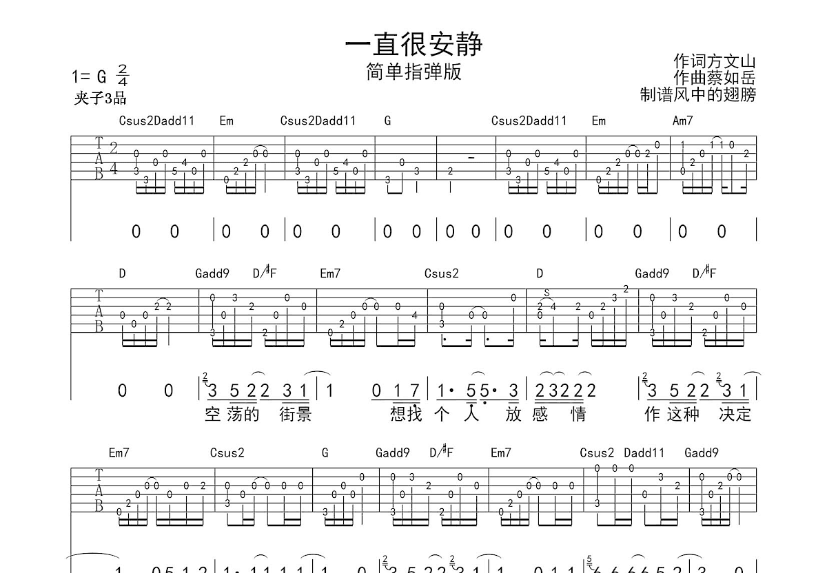 一直很安静吉他谱指弹独奏谱原版完整编配电视剧仙剑奇侠传插曲阿桑演唱示范音频夹子3品