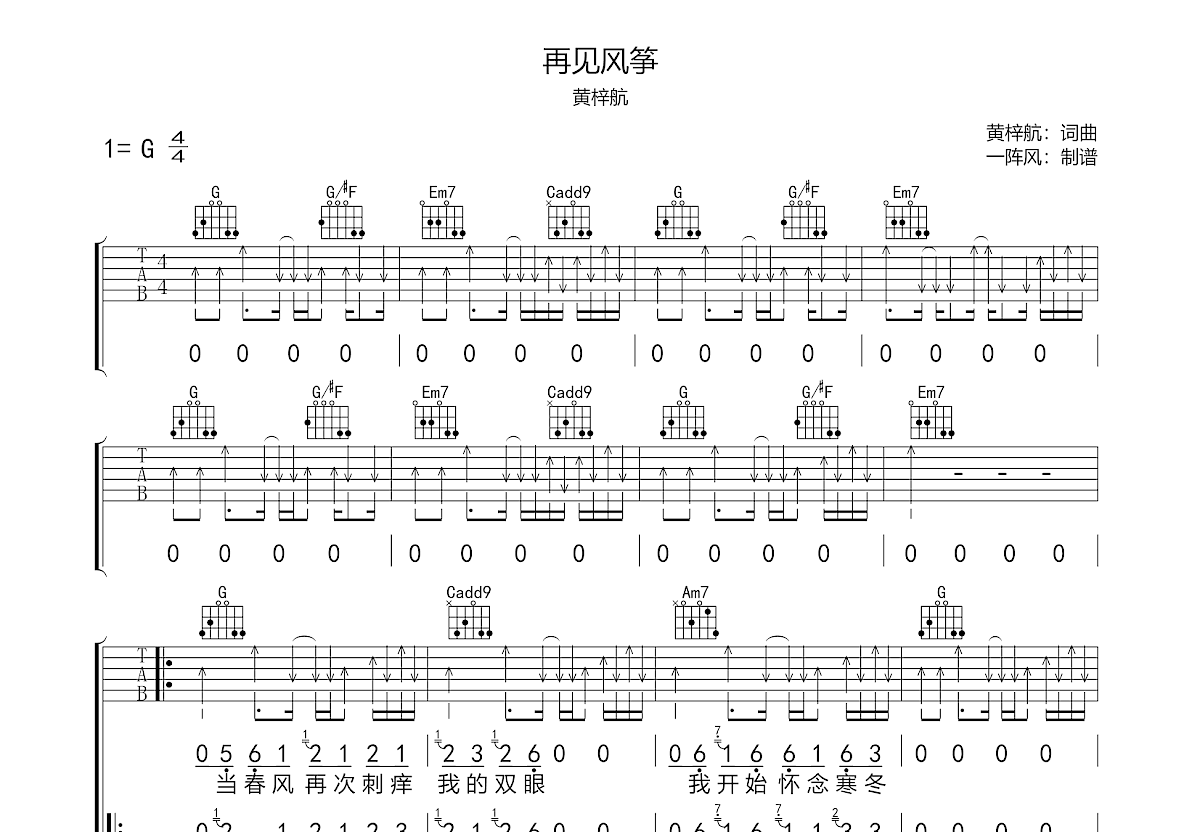 此吉他谱为琴友私人订制。黄梓航《再见风筝》吉他谱。