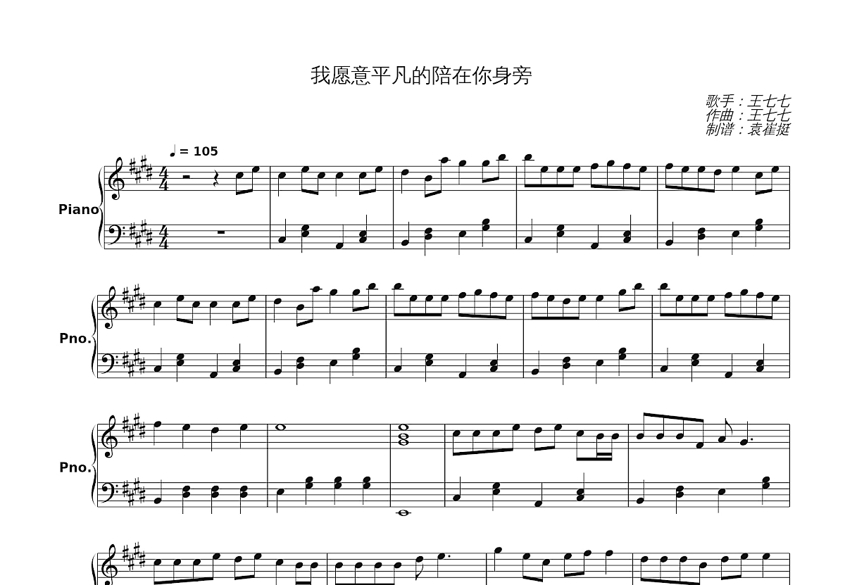 王七七《我愿意平凡的陪在你身旁》E调独奏钢琴谱
