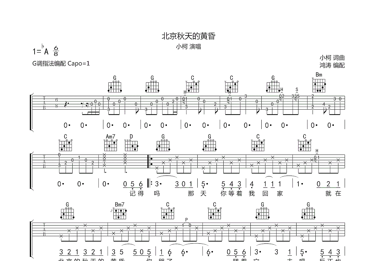《北京秋天的黄昏》弹唱吉他谱,G调指法编配。