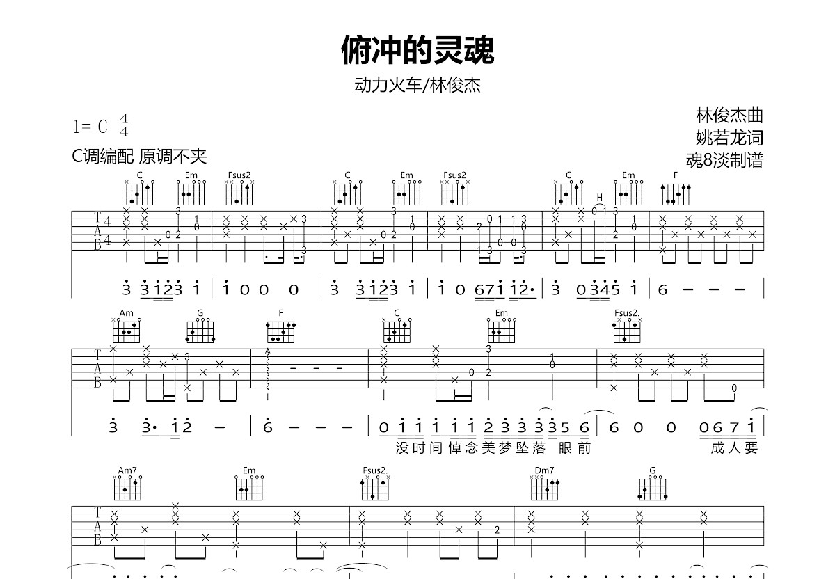 动力火车/林俊杰《俯冲的灵魂》C调吉他谱。好听易上手。