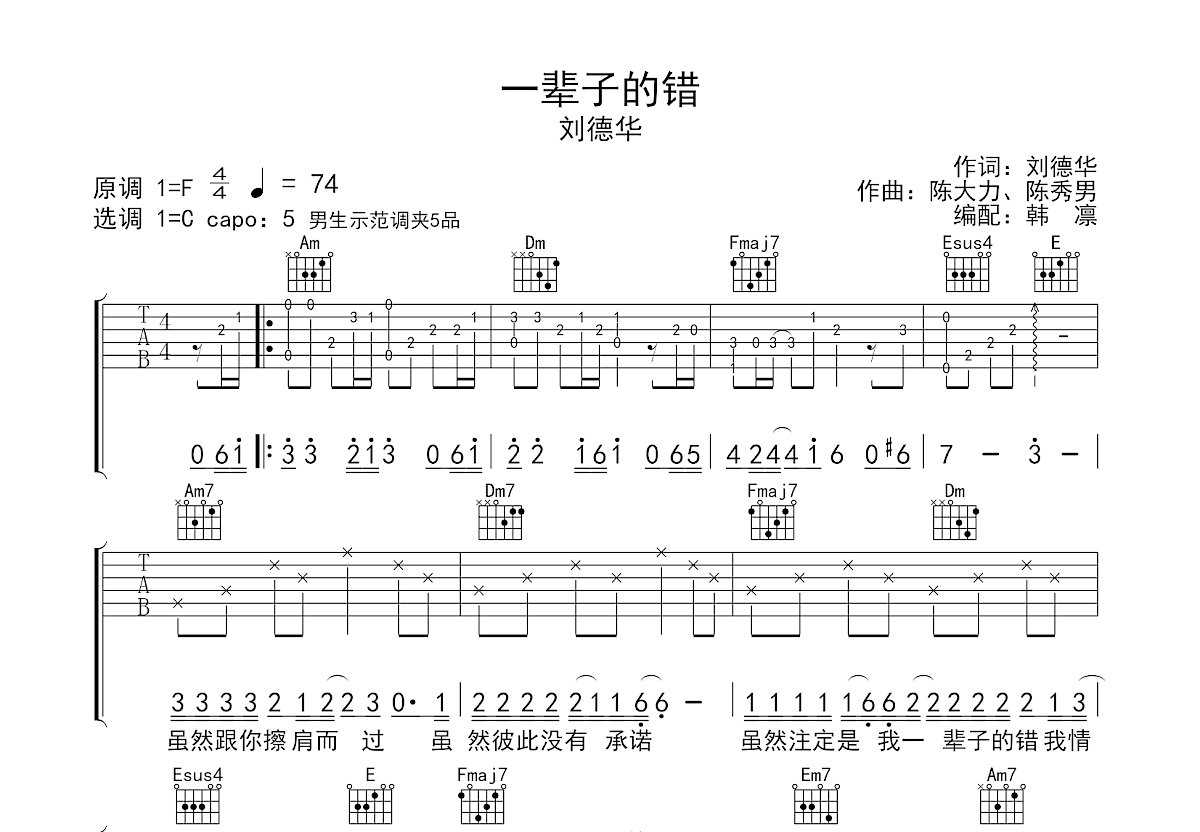 《一辈子的错》刘德华,国语版,粤语版是《假装》,速度74,C调指法,男生示范调夹5品,吉他世界独家发售。吉他/演唱:韩凛